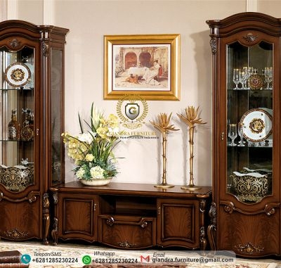 Lemari TV Ukir Mewah – merupakan sebuah desain bufet tv hiasmodel klasik dengan hiasan ukir yang elegan. Bufet TV Jati Ukir Mewah Jarvis ini mempunyai model desain furniture klasik modern yang sangat cantik untuk melengkapi ruang tamu ataupun ruang keluarga anda. Dengan bahan kayu mahoni berkualitas akan menjamin ketahanan dari pemakaian bufet tv ini. Bufet TV Jati Ukir Mewah Jarvis sangat cocok untuk mengisi ruang tamu anda yang bergaya klasik dan modern. Sangat cocok untuk mempercantik ruangan rumah anda yang bergaya klasik modern. Lengkapi ruangan rumah anda agar semakin menarik dan nyaman dengan berbagai model produk furniture buatan kami.