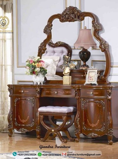 Meja Rias Jati Mewah Magdalena – merupakan sebuah desain “meja rias ukiran” model klasik dengan hiasan ukir yang cantik dan elegan. Meja Rias Jati Lacatto ini mempunyai model desain “furniture klasik mewah” yang sangat cantik untuk melengkapi kamar tidur anda yang mewah dan elegan. Dengan bahan kayu berkualitas akan menjamin ketahanan set “Meja Rias Ukir” ini sangat cocok untuk mengisi ruang tidur anda yang bergaya klasik dan modern. Sangat cocok untuk mempercantik ruangan rumah anda yang bergaya klasik modern. Lengkapi ruangan rumah anda agar semakin menarik dan nyaman dengan berbagai model produk furniture buatan kami.