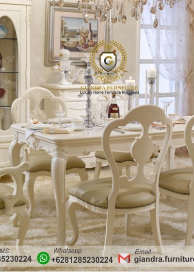 Set Meja Makan Ukir Mewah Jepara – merupakan sebuah desain meja dan kursi makan model klasik dengan hiasan ukir yang elegan. Set Kursi Makan Elegan French ini mempunyai model desain furniture klasik modern yang sangat cantik untuk melengkapi ruang makan anda. Dengan bahan kayu mahoni berkualitas akan menjamin ketahanan dari pemakaian set kursi “meja makan mewah” ini. Set Kursi Makan Elegan French sangat cocok untuk mengisi ruang makan anda yang bergaya “furniture klasik” dan modern. Sangat cocok untuk mempercantik ruangan rumah anda yang bergaya klasik modern. Lengkapi ruangan rumah anda agar semakin menarik dan nyaman dengan berbagai model produk furniture buatan kami.